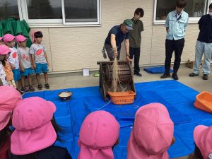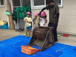 始めにJAの高本さんから、脱穀の説明を聞きました。初めてみる脱穀機に興味津々の子ども達でした。