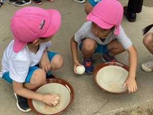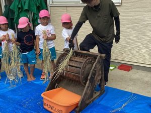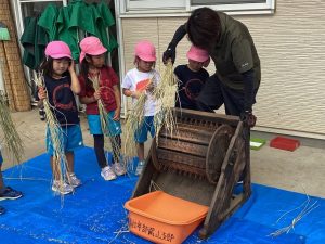 10月7日(火)に先日稲刈りをした稲を使って、脱穀の体験をしました。
