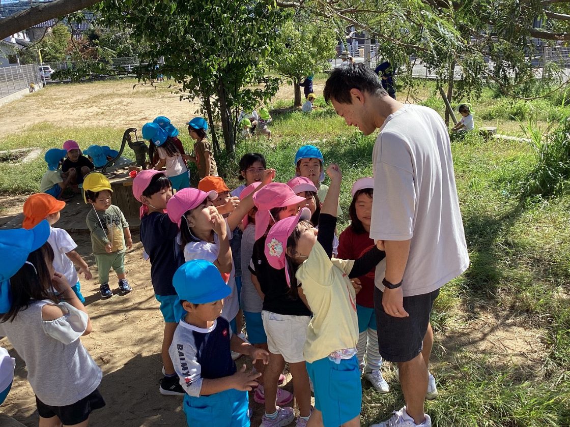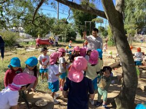 園庭の、木の高い所にある葉っぱにタッチしてみたり、大きなネムの木にぶら下がってみたりとダイナミックな遊びをお父さんと楽しんでいました。「つぎは、わたし!」とお父さんの周りに子ども達がたくさん集まっていました。