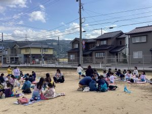 「一緒に食べよう!」「お外で食べるとおいしいね。」お父さんのまわりに子ども達が集まっていました。