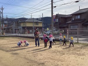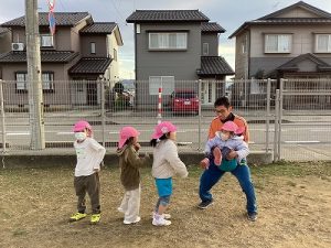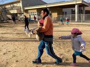 お父さんが鉄棒をしている姿を見て、回転の速さに驚いていた子ども達でした。「わたしも、やってみようかな~。」と楽しむ姿が見られました。