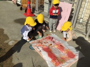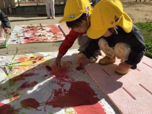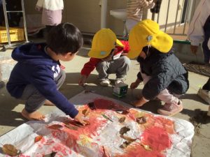 色々な落ち葉と絵の具を使って、真っ白な紙に思い思いに絵を描きました。