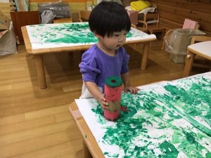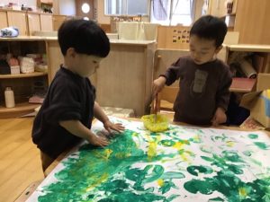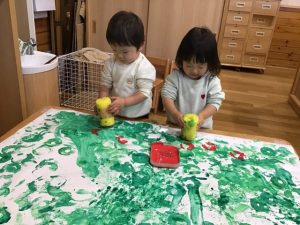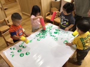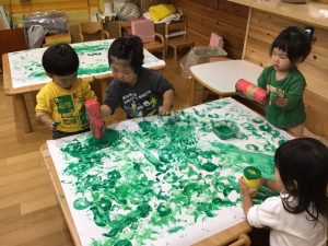 まずは大きな紙に絵の具でペタペタ☆