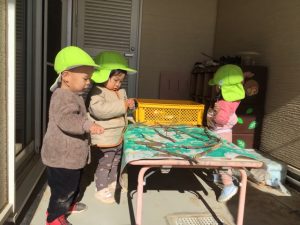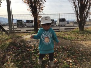 園庭も秋景色になり、葉っぱや木の枝がたくさん落ちていたので