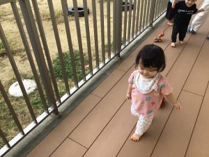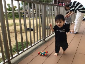 テラスでは、ハイハイやプルトーイを引っ張ったり、手押し車を押したりして、のびのび遊んでいます。