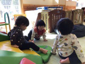 お友達のそばに行ったり、同じおもちゃに触れてみたりと関わりが少しずつ広がっています。