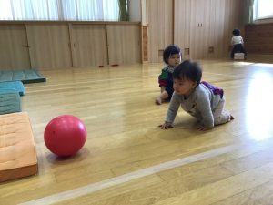 手を伸ばしたり、つまんだり、ひっぱったりと何度も繰り返しながらゆったりと遊んでいます。プレイルームでは、広い