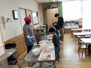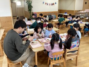 「ここに、すわっていっしょにたべよう!」「おいしいね。」会話もはずんでいました。
